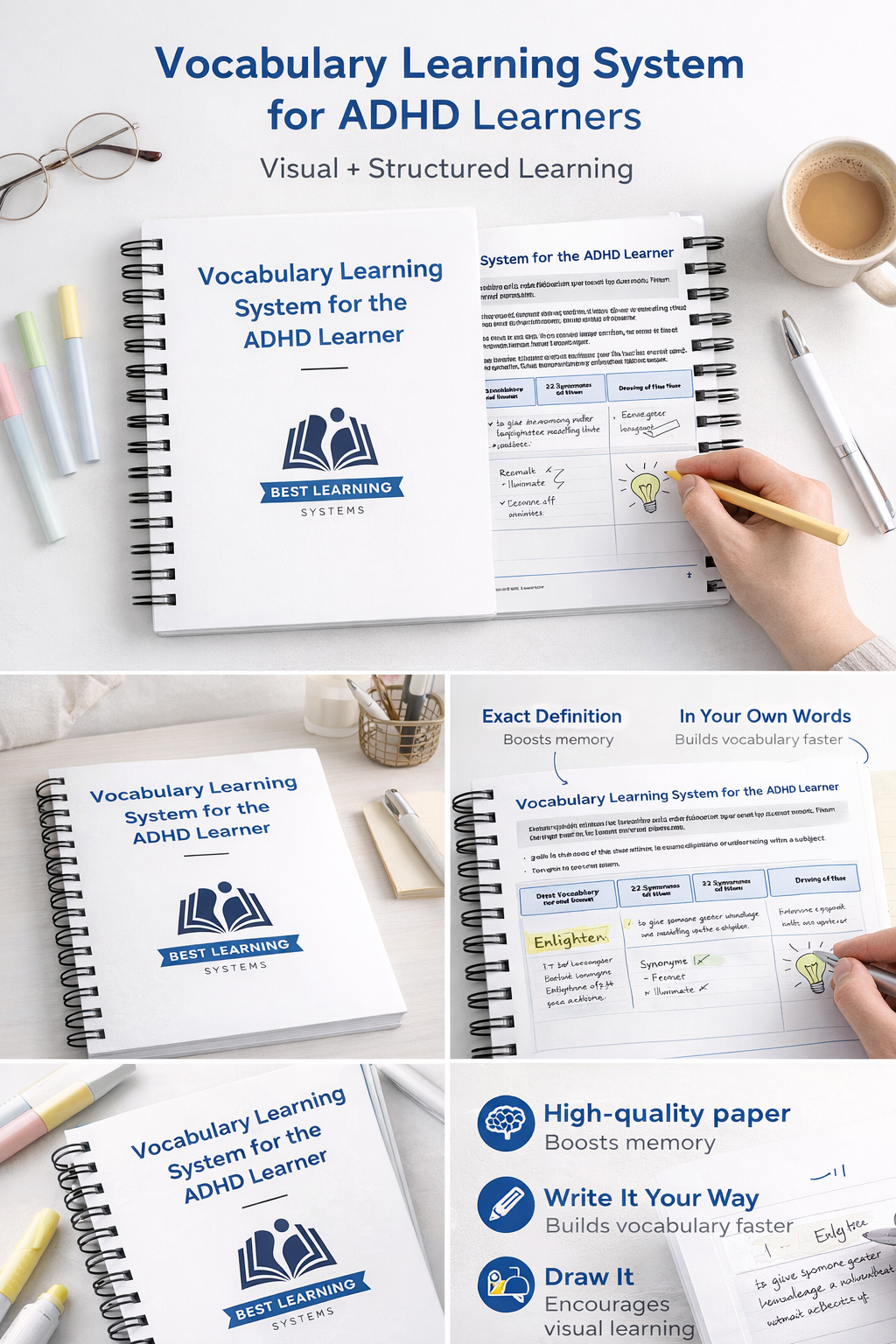 Created specifically for ADHD learners, this system transforms vocabulary building into an interactive, multi-sensory experience. Instead of cramming definitions, you’ll break words down into meaningful parts, connect them to real-life examples, and visualize them in a way your brain naturally remembers.